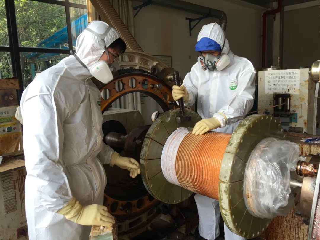 图为磁体研制过程中,科研人员们穿着防护服、戴着防毒面具工作