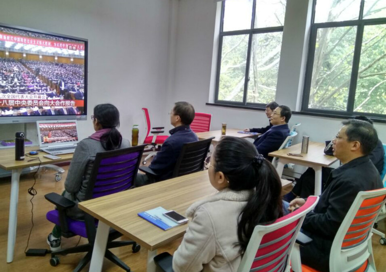 行政党支部认真组织全体职员在西二楼211会议室观看了直播,陈晋书记和罗珺副书记也参加了党支部的集中观看学习。为保证集中观看的参加率,学院办公室提前半天发出通知,要求合理安排工作,将紧急重点事务性工作提前办理完成,在18日上午08:45后暂停办公,并告知各系所师生如有事情急需办理,请他们在早上9点前办理完成或者下午办理。学院行政的全体人员均观看了大会全程。