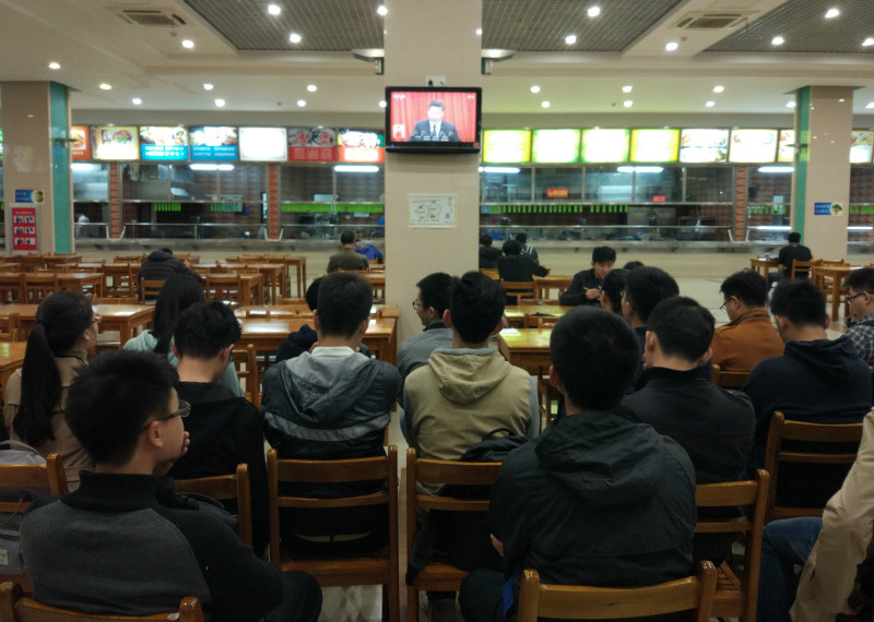 学院严密组织本科生和研究生各党支部观看党的十九大开幕盛况。一大早,同学们常去的食堂沸沸扬扬,党的十九大、“国家进步”、“四个全面”等词语成为同学们热议的话题。接近九点,簇拥在电视周围的同学聚精会神地观看着党的十九大直播盛况,不时爆发出热烈的掌声。