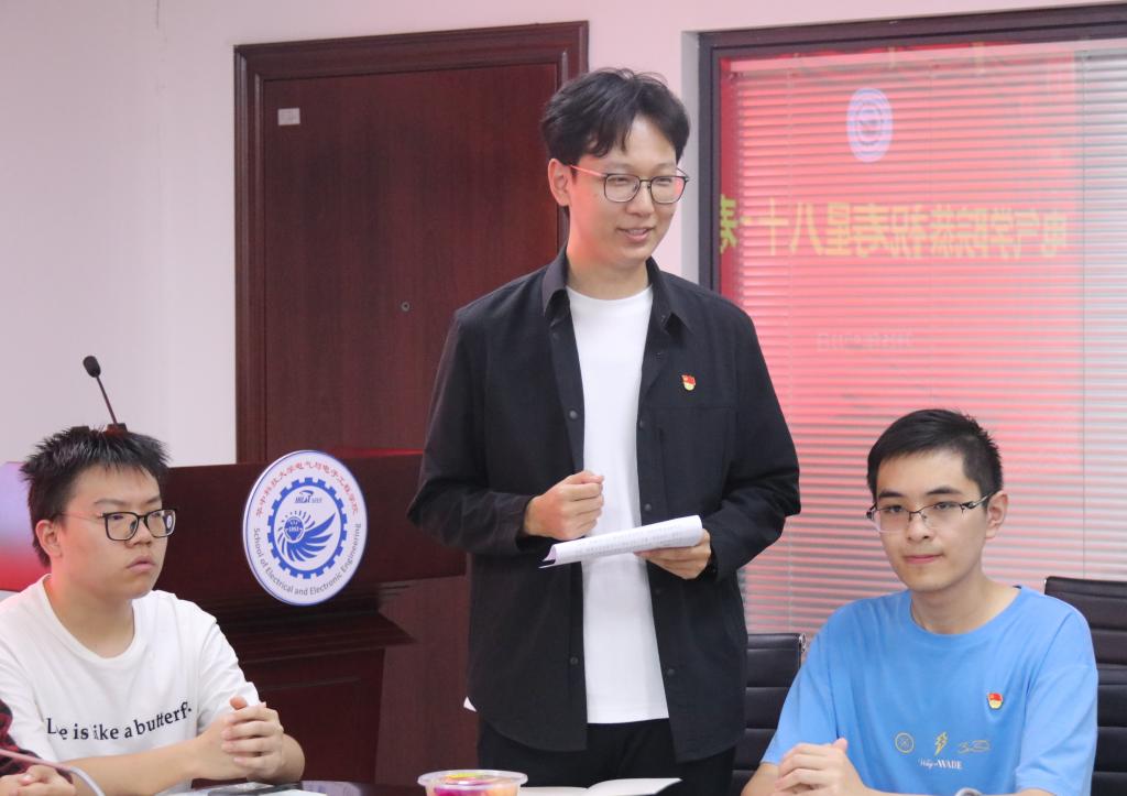电气2022级本科生第三党支部朱健睿作为学生代表发言。他生动讲述了一个科研事迹中汲取灵感的小故事,表达了新一代电气学子对老一辈科学家严谨治学、勇于探索精神的深深敬意。他表示,将铭记老教师们的谆谆教诲,珍惜当下优越的学习科研条件,努力传承和发扬学院的优良传统。