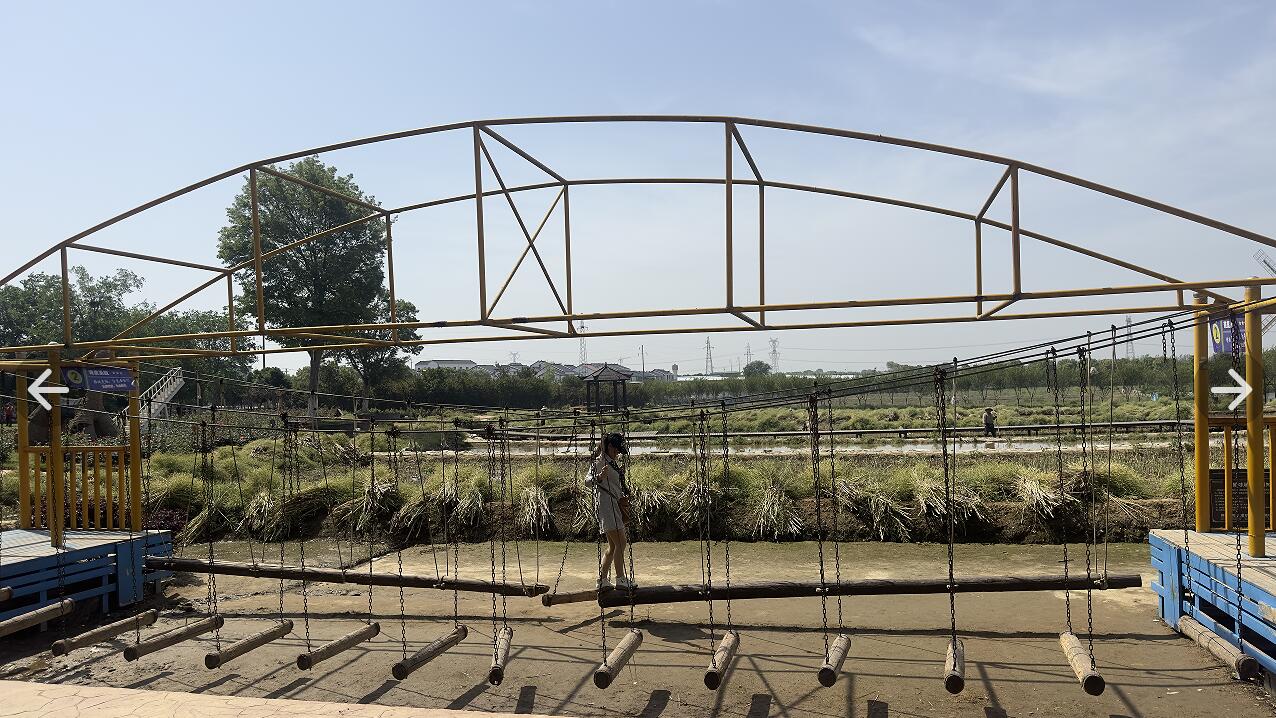 园区内的木桥主要为前来游玩的中小学生们提供,桥身木条仅由上方连接桥架的悬挂铁链构成,下方并不固定,考验着过桥人的身体协调与运动能力。老同志们从不认输,矫健的身姿在桥上显得尤为瞩目,木桥看似晃晃悠悠,老同志的步伐却依旧稳稳当当,这无不展示着老同志们健康快乐的时代风采、老有所乐的精神面貌以及积极向上、永不服输的阳光心态。