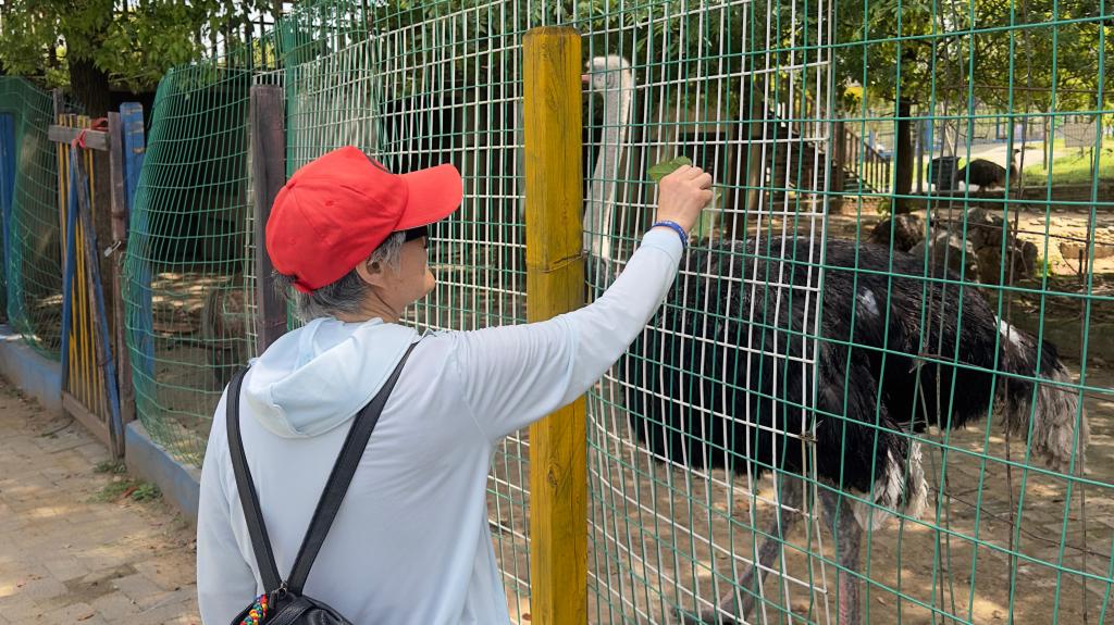 一夜爱老好风吹,新花余热一万枝。园区内的动物表演剧场,以猴子、狗、羊等常见小动物为主角,老同志们看着台上的猴子骑单车、小狗滚筒钻筒等节目,不禁夸其新奇、有趣,惹得大家捧腹大笑。圈养的鸵鸟、孔雀、火鸡等动物可供游客与其互动,老同志们便顿时来了兴趣,上前与动物们来了次“亲密接触”。