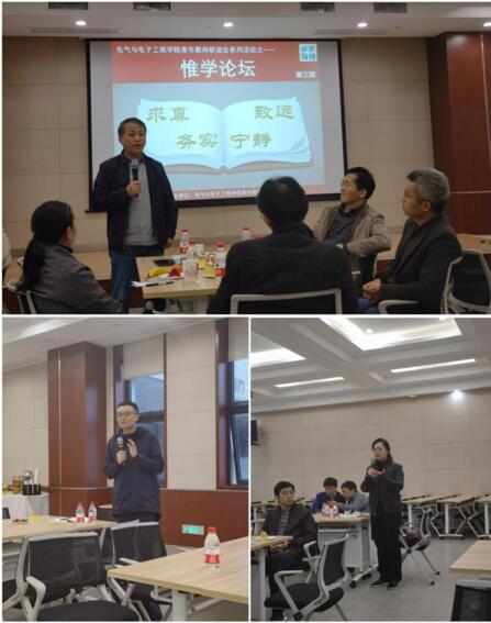 了增进教师间的沟通交流,帮助青年教师进一步的教学成长,2021年3月31日下午两点钟,由华中科技大学电气与电子工程学院青年教师联谊会主办的惟学论坛系列讲座第三期于电气大楼B203顺利举行,主题为“青年教师的教学进阶之路”。本次活动邀请了2020年国家首批一流线下课程(金课)团队—《电磁场与波》教学天团作客,学院主管教学工作的李红斌副院长与杨勇教授作为特邀嘉宾,为广大青年教授们亲身传授教学经验,解读教学工作的相关政策,深入研讨如何做好教学工作以及为青年教师解答在教学进阶之路上遇到的困惑。
