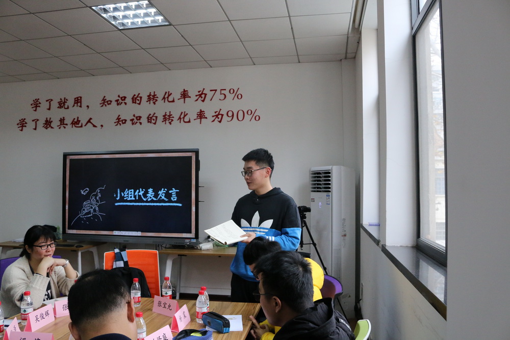 第四组以创新创业为题,同学们分享了参加各类创新活动的经历。研究生班主任陈籽东鼓励同学们大胆创新,要有无惧困难与挫折的勇气,做时代的弄潮儿。