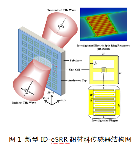 到目前为止,超材料传感器领域仍缺乏一个系统且实用的优化策略,能够统一考虑超材料传感器的所有性能参数,以便进行理性设计(与试错法相比)。该类型传感器研究的另一个不足之处是其通常采用的性能评价参数只适用于分析物的种类、位置和数量相同的情况。为解决上述问题,团队通过将交叉指形结构与电开口环超材料谐振器(eSRR)完美结合,形成新型ID-eSRR超材料传感器(如图1所示),有效提升了传感灵敏度。此外对于均匀薄膜形式放置在传感器上的介质分析物,研究团队建议将传统FOM对薄膜厚度进行归一化得到厚度归一化FOM(TN-FOM),以求更加合理比较传感器性能。