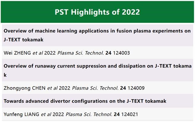317日,等离子体科学与技术(Plasma Science and Technology, PST)期刊公布了13PST Highlights of 2022,华中科技大学聚变所陈忠勇教授团队、梁云峰教授团队、郑玮副研究员团队分别发表的《Overview of runaway current suppression and dissipation on J-TEXT tokamak》(J-TEXT托卡马克逃逸电子抑制与耗散研究综述)、《Towards advanced divertor configurations on the J-TEXT tokamak》(J-TEXT托卡马克上的先进偏滤器位形)、《Overview of machine learning applications in fusion plasma experiments on J-TEXT tokamak》(机器学习在J-TEXT托卡马克聚变等离子体实验中的应用综述)论文入选。