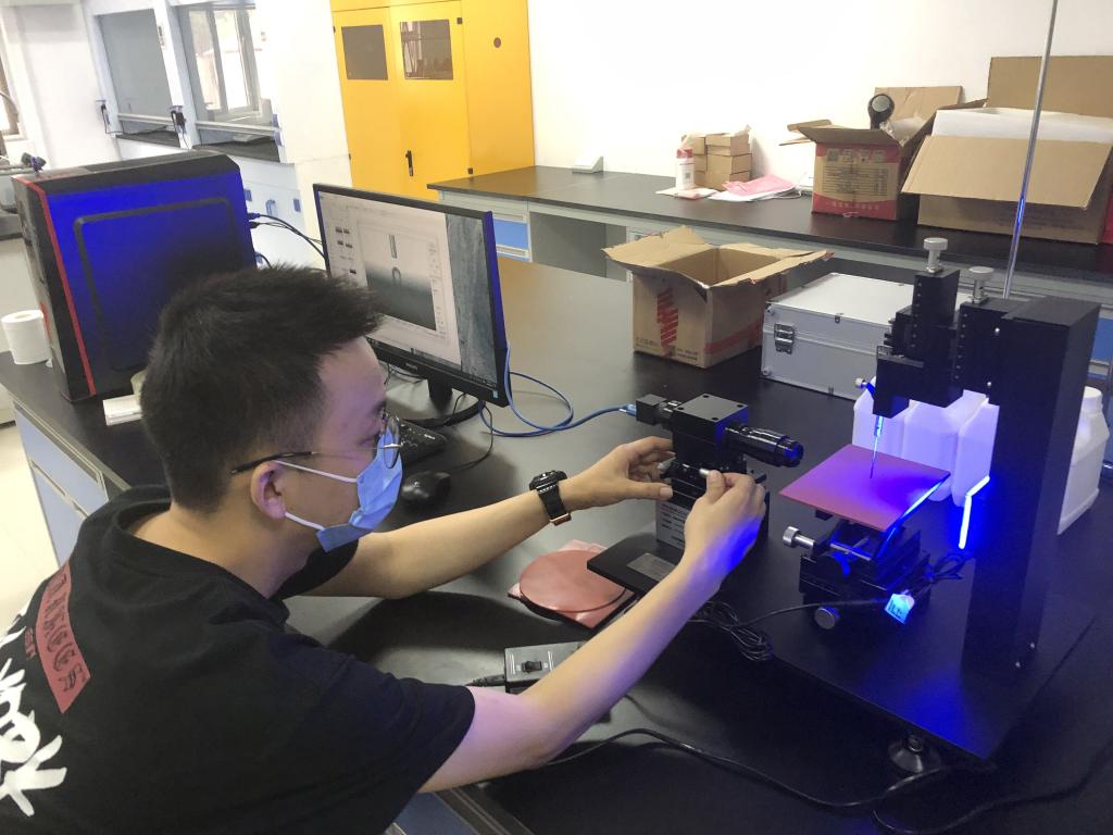 2018级博士研究生盛轲焱在应用电磁工程研究所大楼304室测试辐照改性硅橡胶接触角。