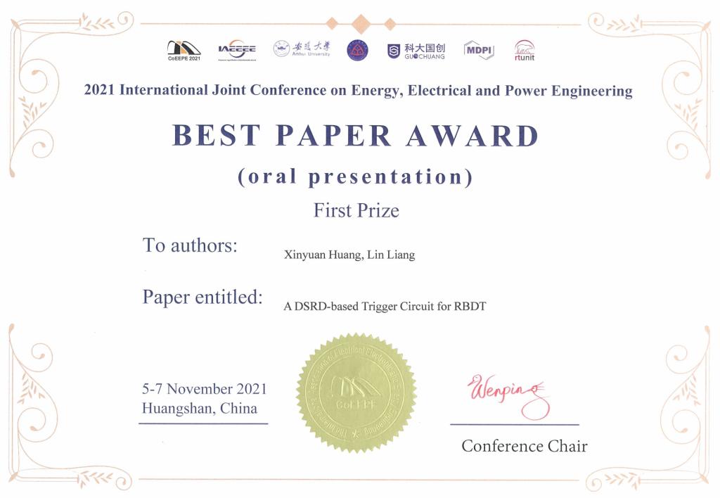 研究生黄鑫远获能源电力与电气工程国际会议最佳论文奖
