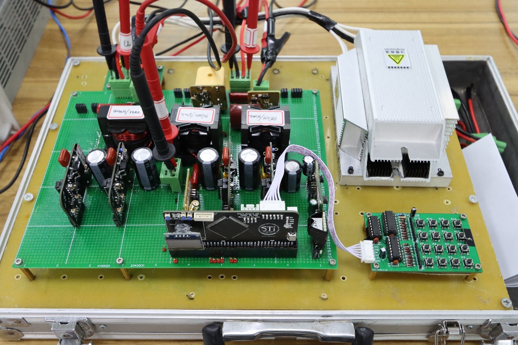 由钟远浩、吕清扬、宁艳钊组成的P02组作为基地“老牌”队伍,他们在一年的培训里从最基础的模块以及代码开始,逐步实现一个简单的BUCK电路,到暑期培训中完成在线式不间断电源以及单相整流器,最后省赛上制作单相交流电子负载。一路走来从无到有的经验,他们在第二天便完成了电路的制作。最开始作品的损耗3.5W,经过电感重新绕制,更改PI参数等一系列方法,成功将系统的损耗降低到2W,最终成功完成比赛测评获得湖北省特等奖。
