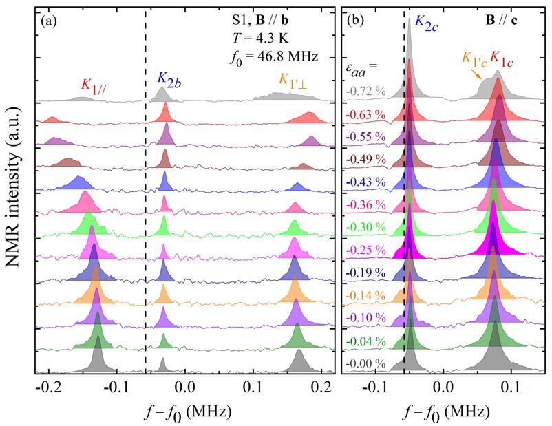 图2 应变下17O核磁共振的核磁共振图谱。图中所示为17O的-1/2↔1/2核激发跃迁峰。