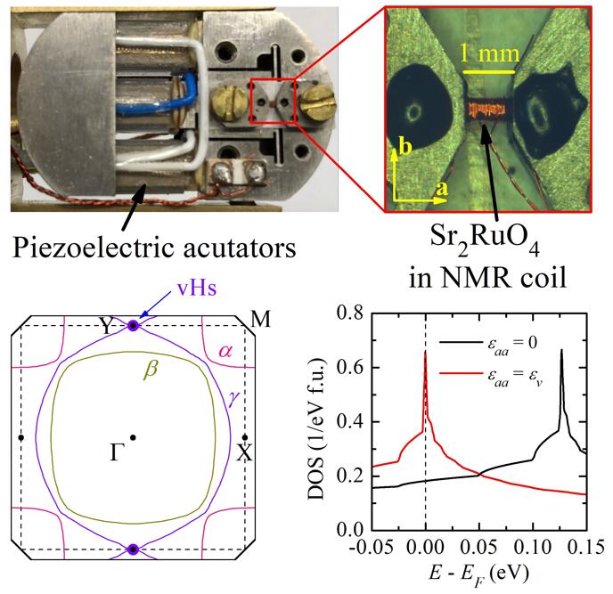 图1 上图所示为单轴应变下NMR测量装置。下图所示为应变下Sr2RuO4的费米面结构,