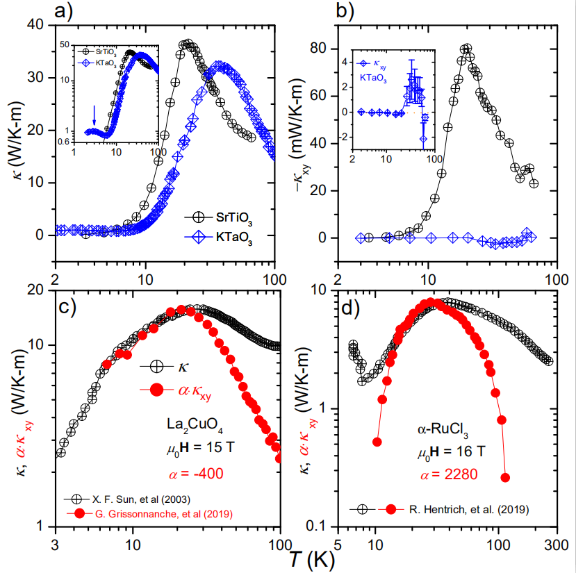 3月9日,《物理评论快报》(Physical Review Letters)在线刊发了中心16级博士生李小康(导师为朱增伟教授)关于非磁绝缘体的声子热霍尔效应的研究论文“Phonon thermal Hall effect in strontium titanate”。该研究在非磁绝缘体SrTiO3中观测到了比任何绝缘体都要大的霍尔热导。同时,通过选取SrTiO3和其类似物KTaO3开展对比实验,探讨了声子热霍尔效应的起源机制,发现SrTiO3中有非常大的热霍尔效应,而KTaO3中的霍尔热导几乎为零,证实了SrTiO3在反铁电扭曲(AFD)转变后出现的畴壁可能是散射声子发生横向偏转的原因(图4)。
