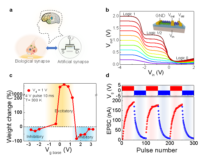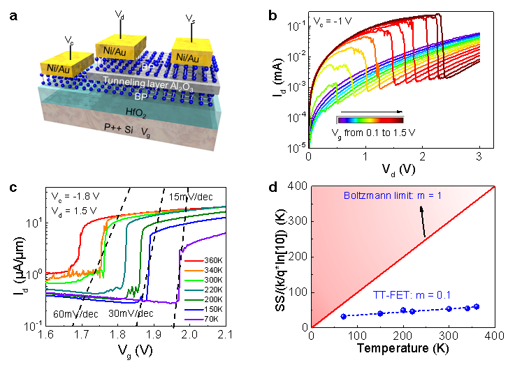 1月31日和2月3日,《先进功能材料》(Advanced Functional Materials)、《自然•电子》(Nature Electronics)先后刊发中心微纳电子器件课题组关于二维范德华异质结的研究论文。在“基于二维异质结构的可重构逻辑存储一体器件和多语人工突触”(Reconfigurable logic-in-memory and multilingual artificial synapses based on 2D heterostructures)论文中,展示了基于二维半导体黑磷和二硫化铼的二维范德华异质结构用于实现非易失性三进制逻辑运算器件(图1),其中黑磷界面处的超薄氧化物层起到了俘获电荷并实现存储信息的作用,为基于新颖的二维异质结构实现多功能非易失性存储器及逻辑应用提供了一种途径。在另一篇“基于范德华异质结的垂直隧穿场效应晶体管”(A transverse tunnelling field-effect transistor made from a van der Waals heterostructure)论文中,提出了一种由二维黑磷/氧化铝/黑磷结构制成的高效隧穿器件(图2),室温下峰谷比即可超过100,同时能够在360 K至70 K的温度范围内实现超陡亚阈值斜率,以仅为玻尔兹曼极限1/10的体因子(栅极电压相对变化与表面电势相对变化的比值)进行电流的陡峭开关。