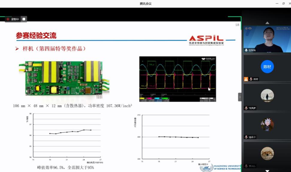 大赛启动仪式结束后,本届竞赛秘书处成员、华中科技大学陈材老师主持了大赛辅导说明会议,并代表组委会,对竞赛的题目技术要求、组织形式、时间节点、技术难点以及需要注意的问题进行了辅导与说明。往届获奖参赛队代表华中科技大学博士生伍纵横同学向本届参赛同学介绍了队伍组织、进度把控、现场调试等参赛经验。冠名赞助单位GaN Systems 公司和联合赞助单位宁波希磁电子科技有限公司在参赛辅导说明会上为各参赛队带来了专业的技术辅导,包括最新GaN器件的使用方法、相关性能以及行业前沿技术等,帮助参赛队更加顺利的完成竞赛作品设计工作。