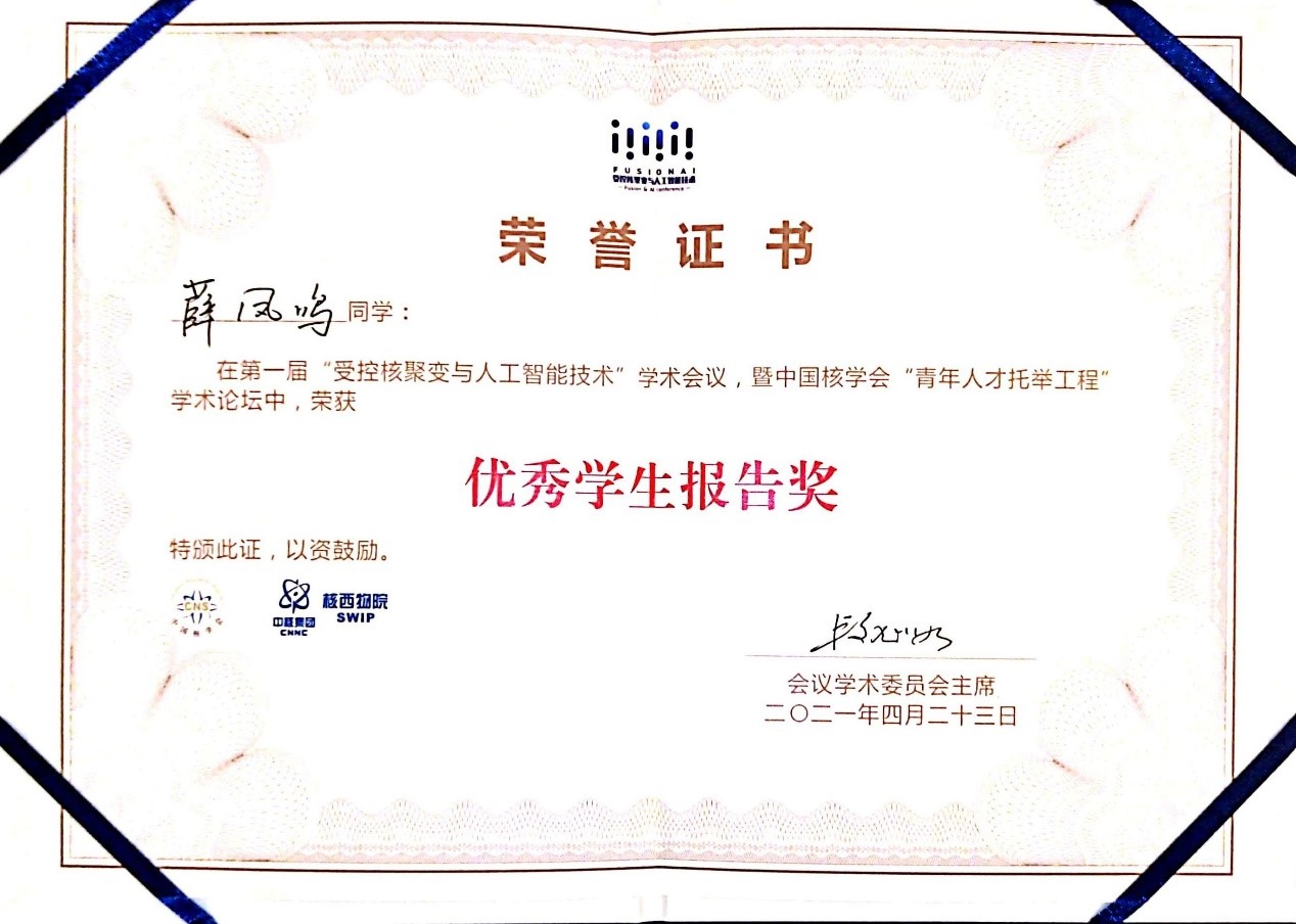 聚变所教师郑玮和沈呈硕、艾鑫坤、张智超、唐畴尧与薛凤鸣等5名研究生参加会议。郑玮与五名研究生分别在大会上进行了邀请与口头报告。薛凤鸣同学题为“J-TEXT装置上基于深度学习“混合”神经网络的等离子体破裂预测”的报告获会议“优秀学生报告奖”。
