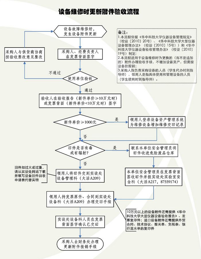 3、使用单位派人持购货合同、发票和换下的旧零配件到实验室与设备管理处办理终审手续;对于过大、过重或有毒性、放射性的旧零配件,则填写《设备旧件回收申请表》代替实物,由实验室与设备管理处负责回收处置。需要使用旧件折抵新件货款的,由使用单位审核,并附相关合同,经实验室与设备管理处批准,可免交旧件。