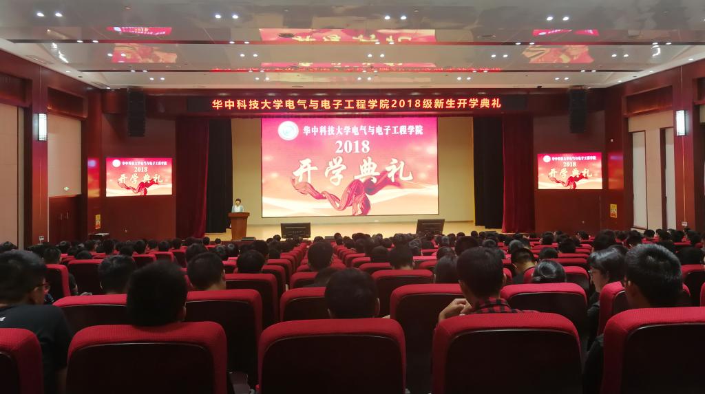 本次新生开学典礼,是电气学院新大楼(简称电气大楼)的首次使用。B205报告厅共有432座位,会议期间会场座无虚席,位于报告厅正前方写有“开学典礼”四个大字的巨大电子屏亮丽的色彩,营造出庄重和热烈的氛围。院长文劲宇、院党委书记陈晋,副院长张明、林磊、樊宽军、杨凯,党委副书记罗珺,2018级教师班主任、研究生班主任,学院相关科室的负责人等参加了开学典礼仪式。开学典礼由院党委副书记罗珺主持。