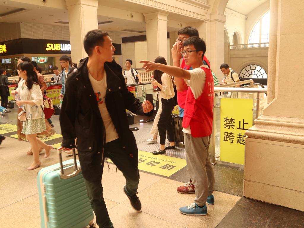 假期之初正是客流量高峰,归家的游子和出行的游客挤成一片人海,各大车站都人满为患。一百余名华中大学子分成十五个小组,在这里作为志愿者,发扬志愿者精神,在各处岗位上开展公益活动。他们在入口为路人指路;在候车厅和取票口维持秩序;在咨询台友好微笑、耐心指导……