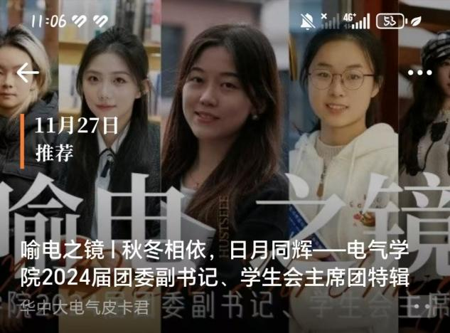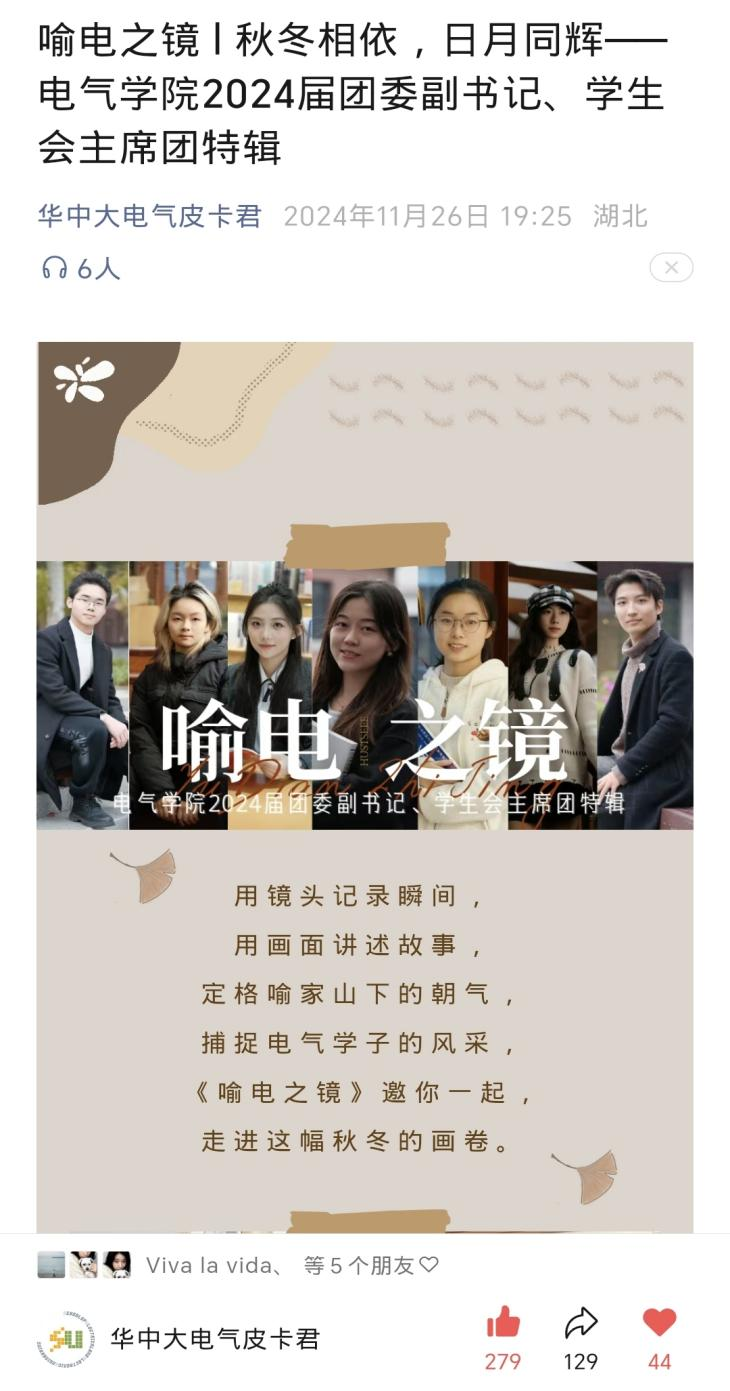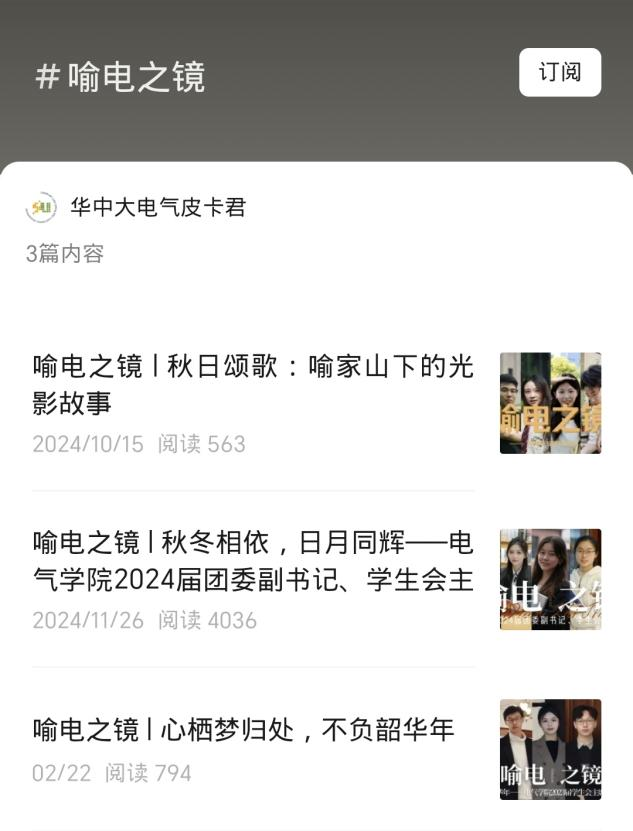 此外,学院团委立足学科特色,打造电气特色校园文化品牌,以多元活动激发青春动能。由“E路同行”院史学讲团打造行走的思政课,学讲团深入团支部宣讲10余次,面向院友开展院史长廊宣讲20余次;《喻电之镜》专栏用镜头记录瞬间,用画面讲述故事,定格喻家山下的朝气,捕捉电气学子的风采,单期阅读量破4000,点赞量近300次,转发量超120次,并成为企业微信的首篇日推,通过新媒体传播实现破窗效应;学生原创音乐作品《青春盛夏》以跃动音符记录校园点滴,引发广泛共鸣,成为电气学子的“青春BGM”。
