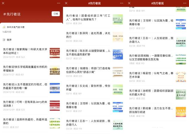 推出“电力全开”电气学院学生活动月历专栏,以公众号为载体集成德智体美劳多维育人活动,将零散活动转化为系统化成长图谱;升级《先行者说》专栏,至今已深度采访17位团学骨干,以“成长故事+经验凝练+价值传递”三维叙事展现青年领航者的精神图谱,发挥朋辈引领作用。