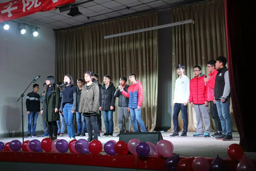 欣赏完歌曲,接下来是心理部和组织部的节目《社会青年》。参演的同学一身黑衣戴着墨镜,十足的“社会”范儿。其间还有男生女装走秀飞吻,引得场下一片尖叫。之后是网络部和学术部2017年应景的pk《葫芦娃大战小矮人》。《成都》与《天行九歌》的深情演唱,舞蹈的激烈pk,实在难分胜负。