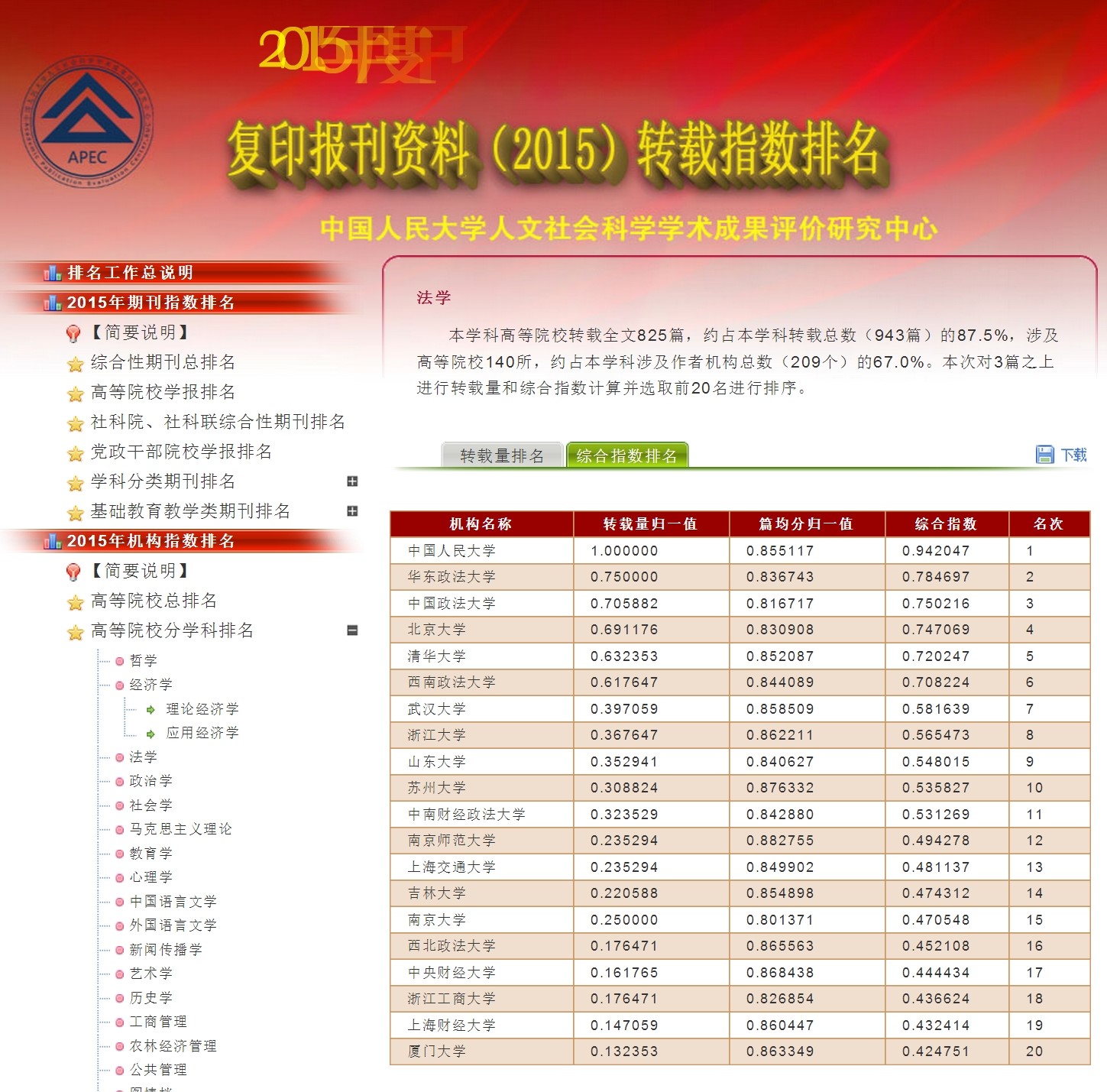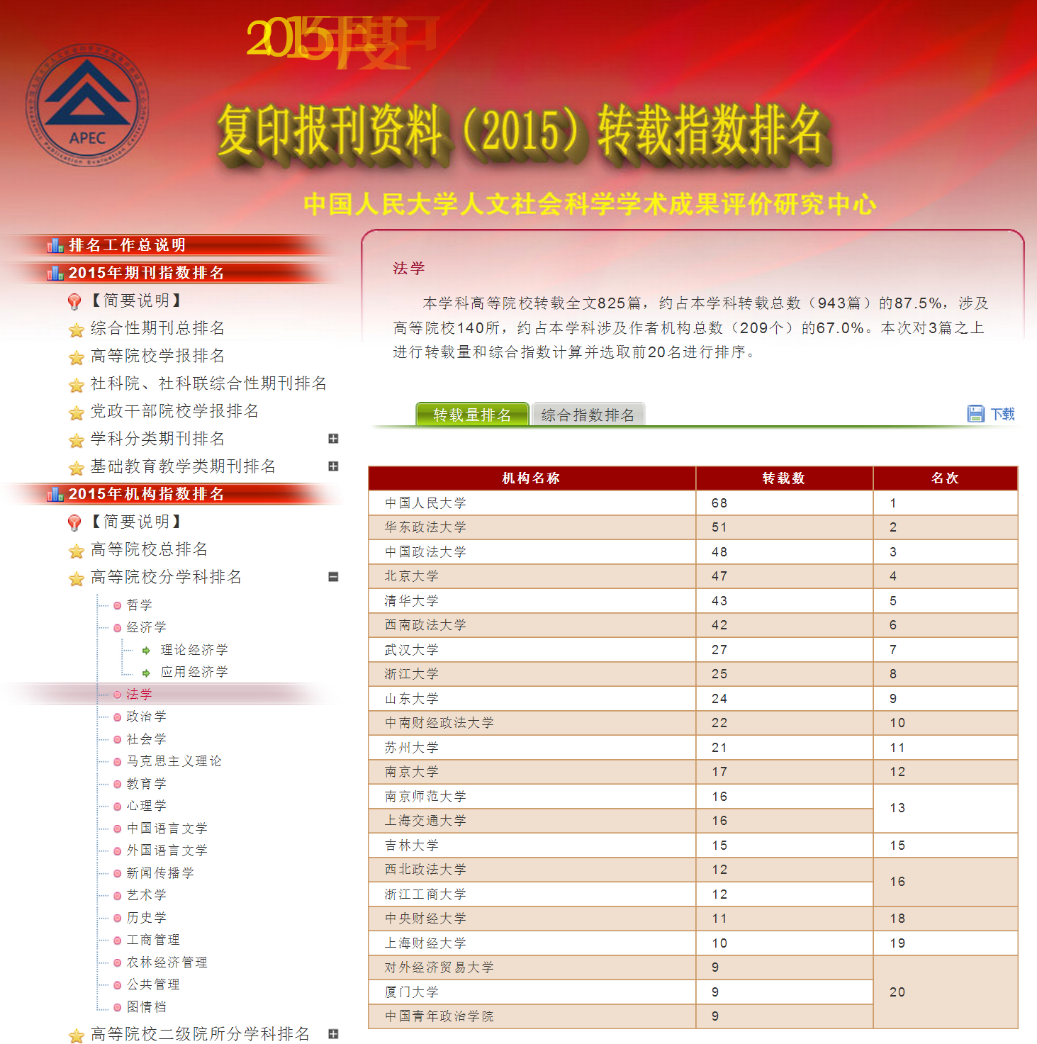 中国人民大学人文社会科学学术成果评价研究中心根据2015年度复印报刊资料学术系列刊的全文转载数据,从转载量、转载率和综合指数3个量度,分别进行了期刊排名和机构排名。这个至今已连续16年在《光明日报》《中国新闻出版广电报》等媒体公开发表的转载排名,基本客观地反映了中国人文社科学术期刊、教学科研机构的学术研究水平和状况,受到了社会的广泛关注和高度重视,成为评价人文社科期刊学术影响力和人文社科研究成果水平的参考依据之一。