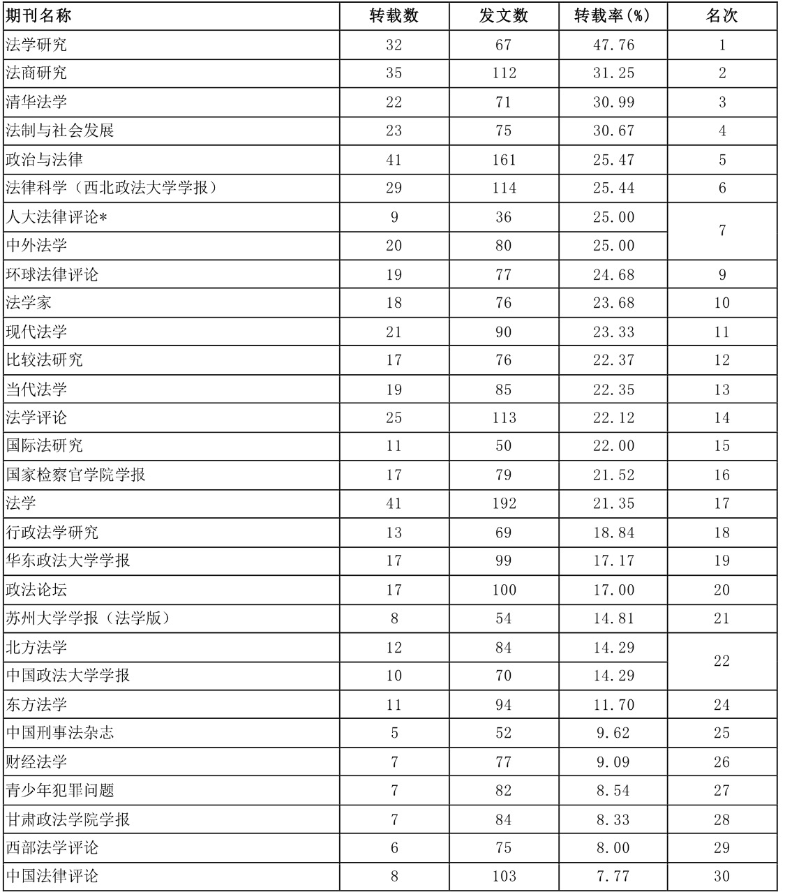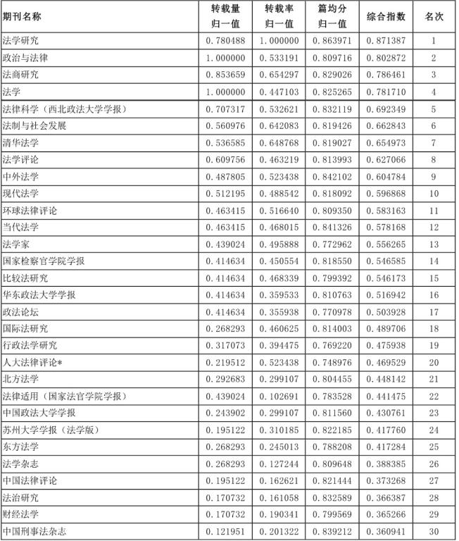 日前,由中国人民大学人文社会科学学术成果评价研究中心、书报资料中心研制的2017年度复印报刊资料转载指数排名正式发布。此次“法学学科期刊排名”中涉及全文被转载的期刊数量为181种,我校主办的《财经法学》上榜,全文转载量排名、全文转载率排名,综合指数排名都进入前30强,创历史新高。其中,全文转载量排名第30名,全文转载率排名第26名,综和指数排名第29名。这也是《财经法学》自2015年创刊以来连续第2次上榜。