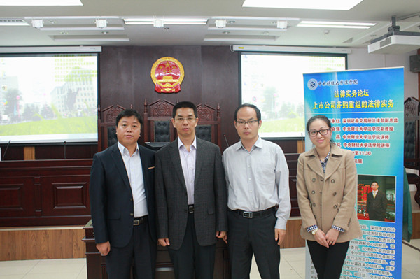 2014年10月19日,以“上市公司并购重组的法律实务”为主题的法律实务论坛讲座于我校中财大厦模拟法庭顺利举行。本次讲座由深圳证券交易所法律部副总监邱永红主讲。邱永红毕业于厦门大学法学院国际经济法专业,法学博士,兼任中国证券法学研究会常务理事、副秘书长,深圳市政府法律专家咨询委员会委员,深圳证券交易所上市委员会委员、纪律处分委员会委员、并购重组工作小组成员、中小企业私募债券备案工作小组成员、退市制度改革小组成员、创业板工作小组成员、股权分置改革工作小组成员等职务。我院邢会强副教授出席了本次讲座并担任主持人,出席讲座的还有受邀作为评议人的我院杜晶博士、董新义博士及其他众多师生。