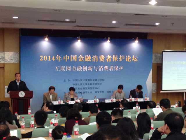 2014年中国金融消费者保护论坛3月12日在中国人民大学逸夫会议中心举行。本次会议以“互联网金融创新与消费者保护”为主题,由中国人民大学重阳金融研究院、中国人民大学金融法研究所等主办,互联网金融千人会、金融315网等机构协办。我院院长郭锋教授应邀出席,对互联网金融的发展与监管问题做了评述,金融法研究所所长黄震教授宣读了由的“互联网金融消费者保护倡议书”。中国人民大学常务副校长王利明教授、中国证监会投资者保护局局长、中国人民银行金融消费权益保护局朱红副局长、国际商会执董张燕玲、北京市金融工作局党委霍学文书记、北京银监局逯剑局长、中国人民大学法学院副院长杨东教授、中国人民大学重阳金融研究院副院长王文教授共200多名专家学者出席论坛交流。