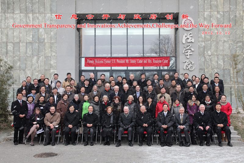 2012年12月12日至13日,由北京大学法学院与美国卡特中心联合举办的“信息公开与政府创新--成就、挑战与展望”在北京大学法学院召开。美国第39届总统吉米•卡特,原国务院法制局局长、中国法学会常务副会长、现任世界组织法研究会会长孙琬钟分别致辞。来自世界银行、国际预算组织、卡特中心、福特中心、亚洲基金会、清华大学、中国政法大学、中国社科院、中南财经政法大学、苏州大学、吉林大学、上海交通大学、南开大学、国家行政学院、天则经济研究所、国际关系学院、中国人民大学、北京航空航天大学、北京市社科院、最高法院、国家预防腐败局、文化部、环保部、商务部、公安部、国家工商总局、教育部、证监会、农业部、上海市法制办等国际组织、科研院所、国家机关约九十余人参加会议,我院高秦伟教授应邀参加了两天的会议。