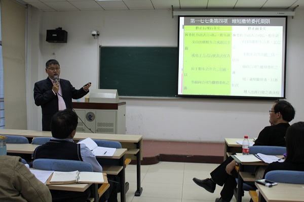 11月18日下午15点30分,在中财大厦二层通二教室举行了一场关于“台湾‘公司法’2011-2013修正条文解释”的讲座,主讲人是台湾政治大学法律系林国全教授,林教授同时也是台湾地区金融消费者评议中心董事长,在金融消费者保护等方面具有丰富的实践经验。本次讲座由邢会强副教授主持,曾筱清教授、杜晶博士出席讲座。