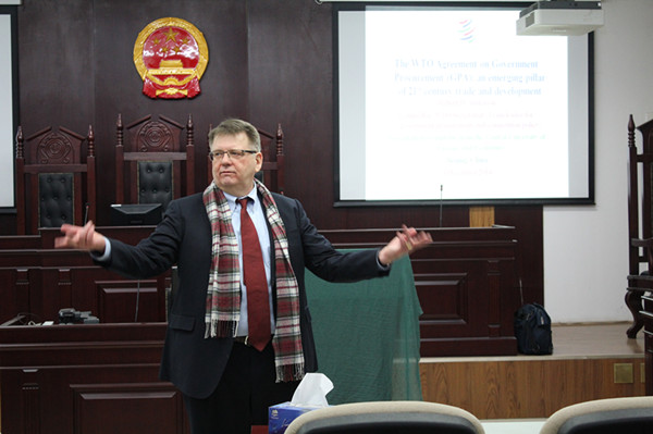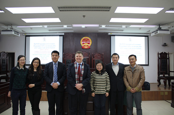 2014年12月3日下午,在学院南路校区中财大厦模拟法庭,我院很荣幸邀请到一位来自远方的贵客:WTO秘书处参赞Robert•Anderson先生为我院师生进行了一场以“The Revised WTO Agreement on Government Procurement: an Emerging Pillar of the Twenty-First Century Global Economy”(WTO政府采购协定的修订:21世纪全球经济的核心支柱)为主题的讲座,我院院长助理沈健博士担任本次讲座的主持人。吴晓丹博士、马静远博士、刘权博士及外事秘书杨威老师也参加了讲座。
