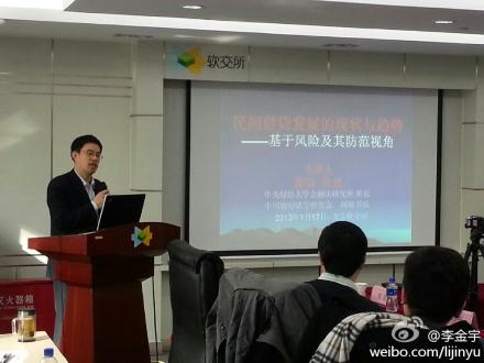 1月17日,由软交所创富中国组织的“百家讲堂”第三十九期暨小额贷款公司专题培训在中关村知识产权大厦举行。创富中国“百家讲堂”系列活动是由北京软件和信息服务交易所主办,本期讲座的目的是为进一步完善软交所科技金融超市,探讨小贷公司运营及民间金融发展趋势,交流小贷、担保公司信息化建设过程中的经验与困惑。我校金融法研究所所长黄震教授作为主讲嘉宾应邀作客百家讲堂,参加培训的嘉宾有来自小额贷款公司、担保公司、投资公司等20多家机构的中高层人士。