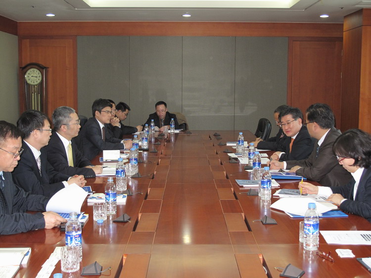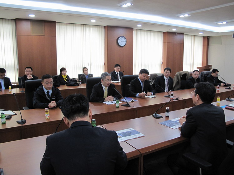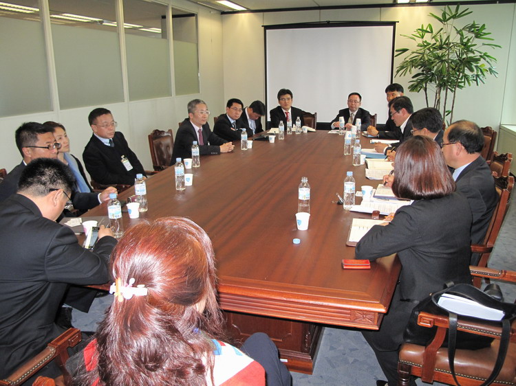 韩国交易所(KRX)科斯达克市场执行董事Kyu Yeon Lee,国际部Kim Brian等接待了代表团,介绍了韩国交易所的历史发展和最新情况、交易产品和上市公司情况、鼓励外国企业来韩上市的举措以及与证券交易有关的法律和规则,回答了代表团成员关于退市问题的提问。韩国证券交易所的前身是成立于1956年韩国股票交易所,2005年与创业板市场(KOSDQ)、期货交易所以及市场交易商协会合并为韩国交易所,现有上市公司1800家,外国企业17家,其中中国概念股15只,共有退市公司60多家。座谈后,代表团成员还参观了韩国证券交易所展览馆和交易大厅。
