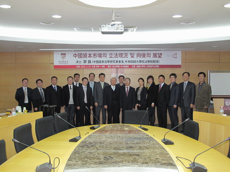 高丽大学法学院副院长、金融法专家金容载教授等接待了代表团成员。郭锋教授在高丽大学法学院发表了题为《中国资本市场立法现状及未来展望》的演讲。弘宜大学国际贸易法教授Byung Woon Lyou接待了代表团,与代表团成员就相关金融、贸易法律问题进行了交流。