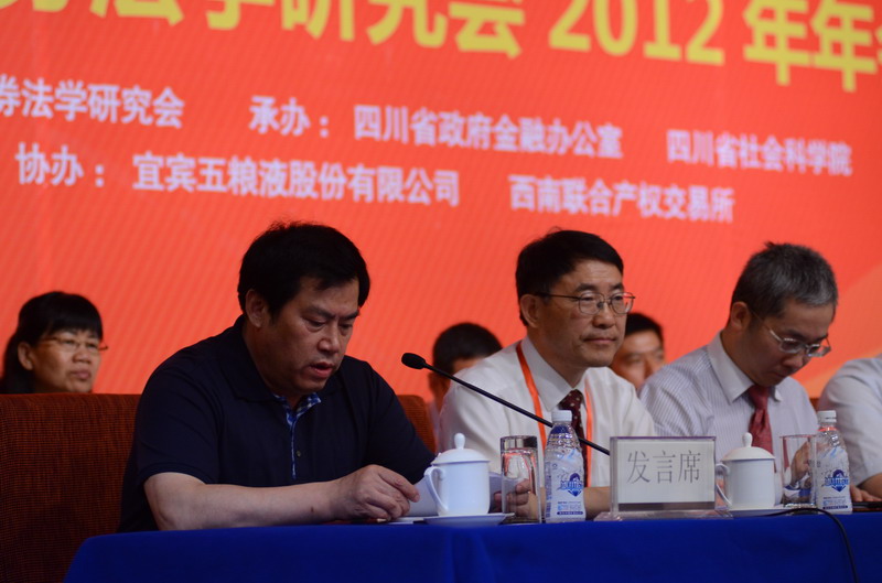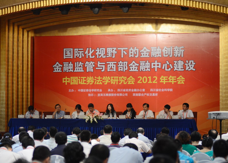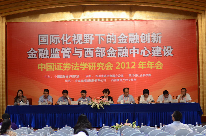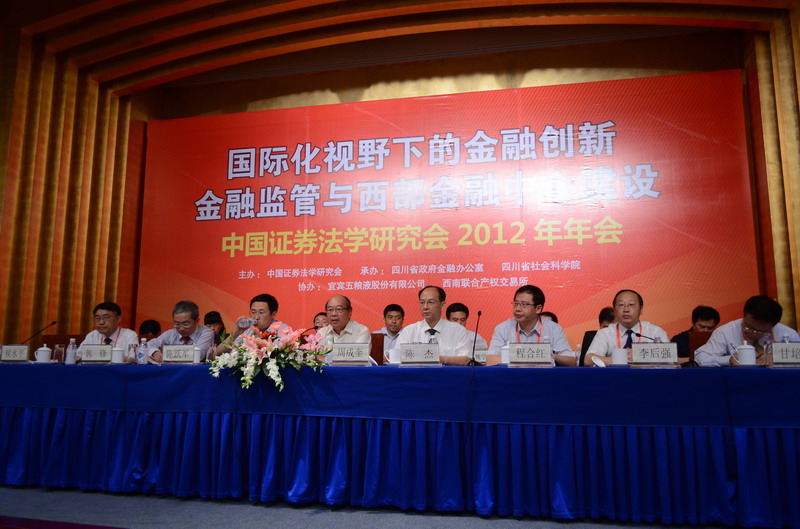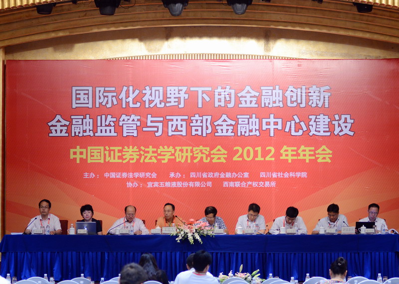 2012年6月15日,成都锦江宾馆迎来一场资本市场的思想盛宴——“国际化视野下的金融创新、金融监管与西部金融中心建设”研讨会暨中国证券法学研究会2012年年会在蓉隆重召开。本次年会由中国证券法学研究会主办,四川省政府金融办公室、四川省社会科学院承办,宜宾五粮液股份有限公司、西南联合产权交易所有限责任公司协办。年会汇聚了全国证券法学术界的专家学者和实务界的精英,共同探讨和研究金融与法律的理论与实践重要问题。