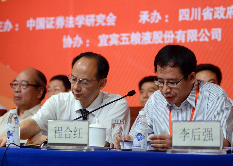 教授主持,四川省政府金融办主任陈跃军受四川省副省长甘霖委托致欢迎辞,四川省政协副主席陈杰出席开幕式。中国法学会副会长周成奎、中国证券法学研究会会长郭锋教授、四川省社会科学院院长侯水平研究员、中国证监会法律部副主任程合红、深圳证券交易所纪委书记魏学春、上海证券交易所副总经理徐明、中国证券投资者保护基金公司总经理庄穆和宜宾五粮液股份有限公司董事长刘中国分别致辞。