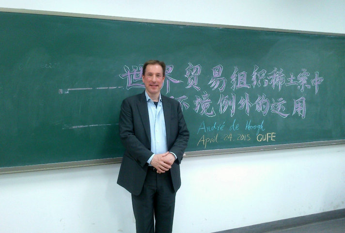 应中央财经大学中国环境金融法研究中心的邀请,荷兰格罗宁根大学法学部安德烈(Andre de Hoogh)教授于2015年4月24日晚在沙河校区408教室举办了题为“世界贸易组织稀土案中环境例外条款的适用”的讲座。中央财经大学中国环境金融法研究中心副主任张小平副教授主持讲座,中心执行主任朱家贤副教授出席讲座。