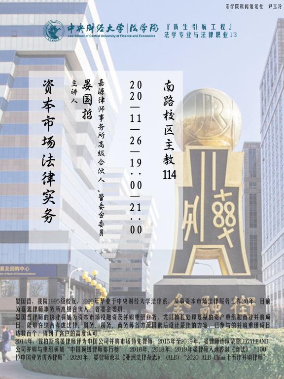 晏国哲,我院1995级校友,1999年毕业于中央财经大学法律系,从事资本市场法律服务工作20年,目前为嘉源律师事务所高级合伙人、管委会委员。