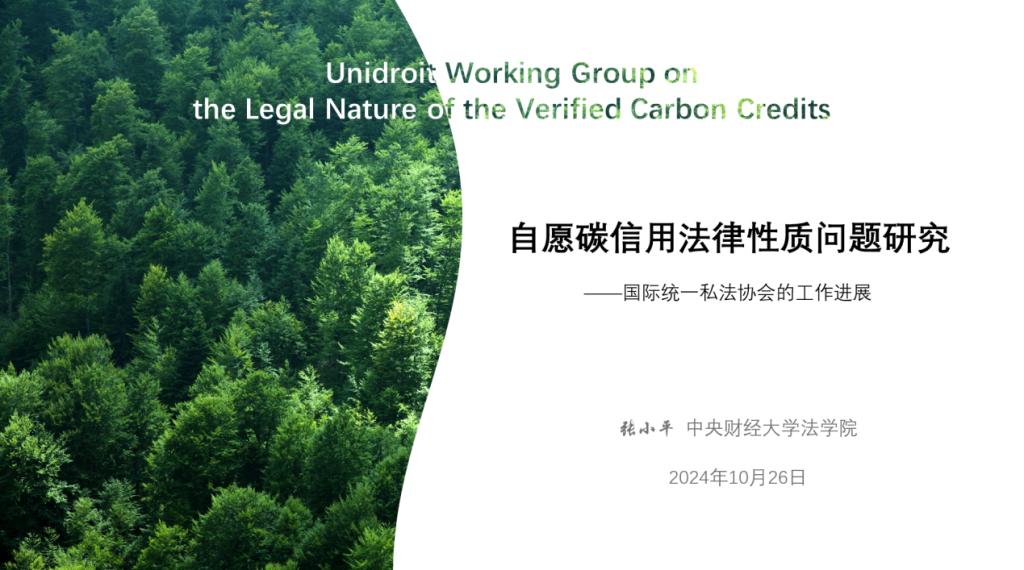 张小平副教授以线上方式参会,发表了题为“自愿碳信用法律性质问题研究:国际统一私法协会的工作进展”,介绍了国际统一私法协会等国际组织在自愿碳信用(VCC)法律性质领域开展相关工作的背景和总体进展、VCC的生命周期和主要参与者等内容,以及国际统一私法协会自第三次工作组会议以来在《议题文件》和《法律原则》两个领域的进展。张小平副教授主要介绍了《法律原则》“第二项 定义”中关于VCC的定义,指出国际统一私法协会目前提出的VCC定义综合了考虑VCC的经济与环境特性、权利的创设、权利的占有等因素,具有较强的解释力,对于认识VCC相关法律制度的内在逻辑,具有核心和基础的意义。张小平副教授还讨论了VCC与中国CCER之间的关系,对CCER的发展定位等问题,提出了相关建议。