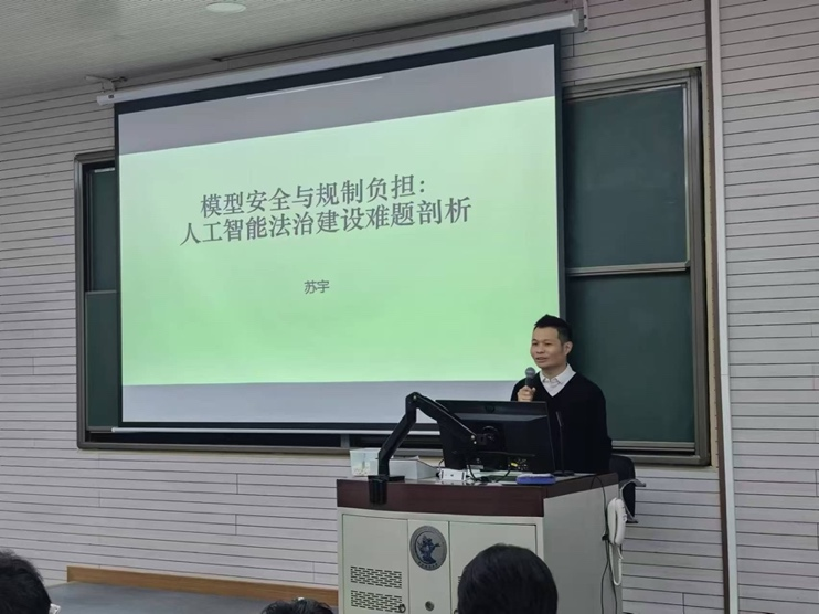 2024年11月13日晚,中国人民公安大学法学院教授、博士生导师苏宇教授莅临我校,以“模型安全与规制负担:人工智能法治建设难题剖析”为主题作专题讲座。讲座由中央财经大学法学院张泽宇讲师主持,法学院李敏讲师及硕博研究生和本科生等百余名师生出席。本次讲座为法学院建院20周年系列讲座第5期,同时也受到中央财经大学“龙马奋进•75周年校庆”专题学术讲座资助计划支持。