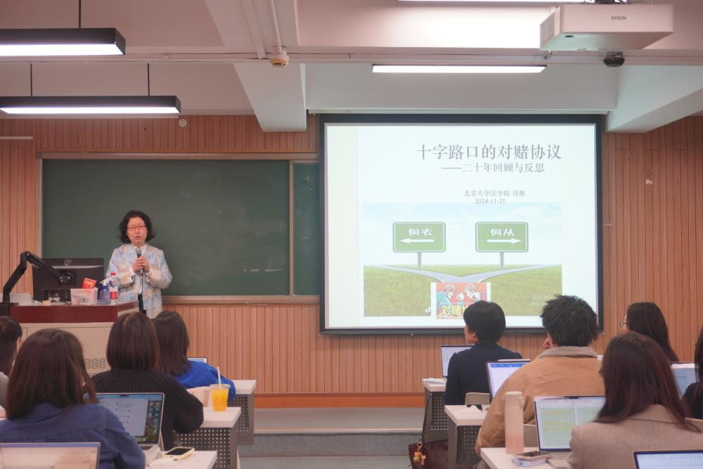 2024年11月21日晚,北京大学法学院教授、博士生导师刘燕教授为我校学生作了以“十字路口的对赌协议”为主题的讲座。本次讲座由中央财经大学法学院讲师李敏主持,法学院周游副教授、王湘淳副教授,中国政法大学民商经济法学院徐可老师,以及校外实务工作者、法学院各年级硕博研究生、本科生等110余名师生出席。本次讲座为法学院建院20周年系列讲座第6期,同时受到中央财经大学“龙马奋进·75周年校庆”专题学术讲座资助计划支持。