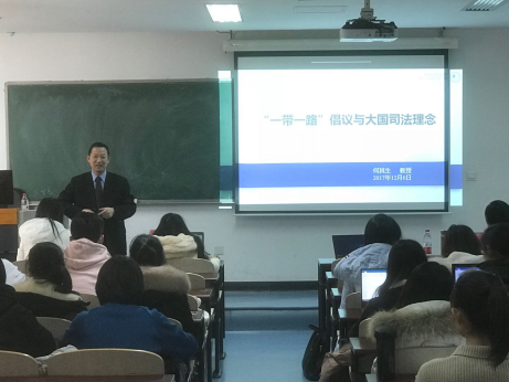 2017年12月20日下午,武汉大学法学院何其生教授应邀来法学院,做主题为“‘一带一路’倡议与大国司法理念”讲座。讲座在沙河校区西区505教室举行,院长助理沈健博士主持,副院长王克玉教授点评。法学院涉外班本科生参加讲座。