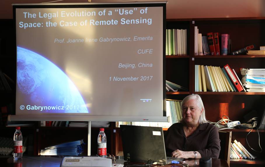 2017年11月1日下午,美国密西西比大学荣休教授Joanne Gabrynowicz女士为我院研究生作学术讲座,主题是“外空利用的法律演进——以遥感技术为例”。讲座由吴晓丹副教授主持。