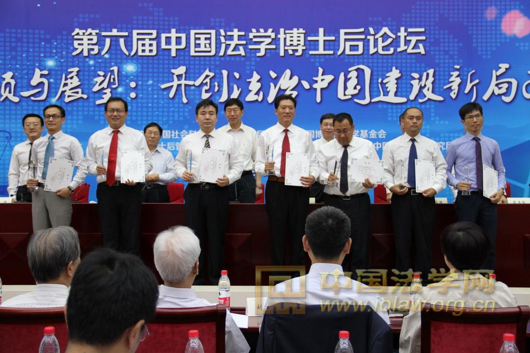 本次论坛上还特别举行了中国社会科学院首届“十大杰出法学博士后”的颁奖仪式。开幕式颁奖环节,中国社会科学院法学研究所所长、学部委员李林研究员宣读了首届“十大杰出法学博士后”称号及提名奖获得者的名单,并由出席本次论坛的嘉宾和领导为获奖者们颁奖。在我国哲学社会科学博士后制度实施25周年之际,法学研究所启动了中国社会科学院首届“十大杰出法学博士后”评选活动。中国社会科学院法学所2004年进站博士后、我校尹飞教授获首届“十大杰出法学博士后”提名奖。