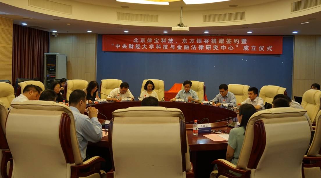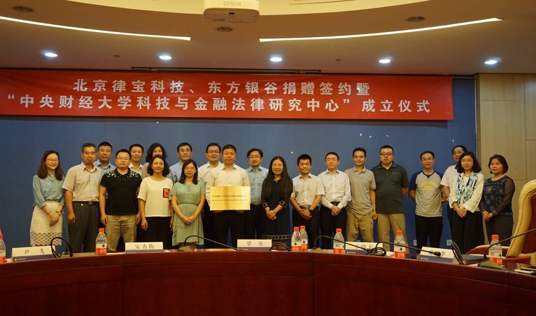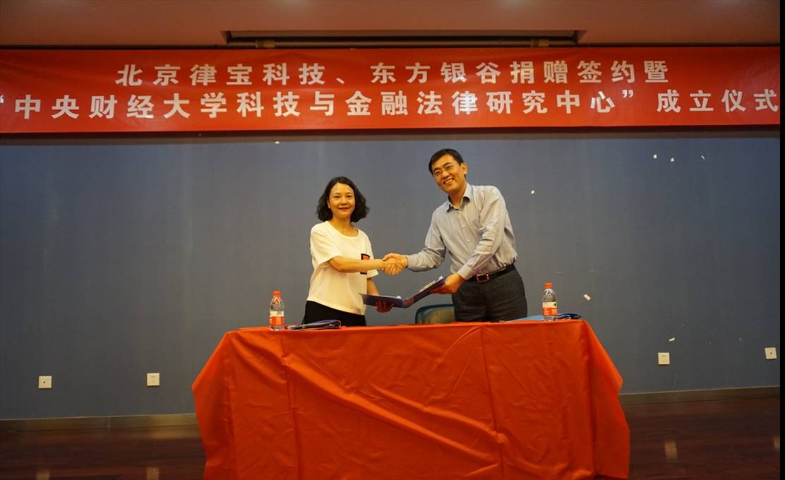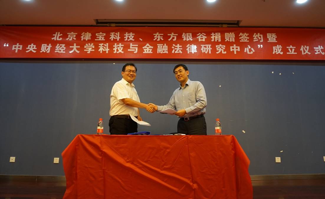 2017年6月16日,北京律宝信息科技有限公司(以下简称北京律宝)、东方银谷(北京)投资管理有限公司(以下简称东方银谷)捐赠中央财经大学法学院签约暨“中央财经大学科技与金融法律研究中心”成立仪式在中央财经大学学术会堂举行。