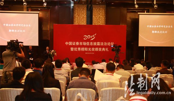 法制网8月29日讯 中国证券市场信息披露法治论坛(2015年)暨优秀榜阳光奖颁奖典礼8月29日在北京四季酒店隆重举行。论坛上发布了《中国证券市场信息披露案例研究与评估年度报告(2014年度)》、《中国证券市场信息披露2014年度优秀榜》、《中国证券市场信息披露2014年度警示榜》。本次论坛由中国证券法学研究会、民生证券有限公司主办,法制日报法制网独家全程直播。来自证券实务界、研究界、上市公司、中介机构近四百人参加了此次会议。