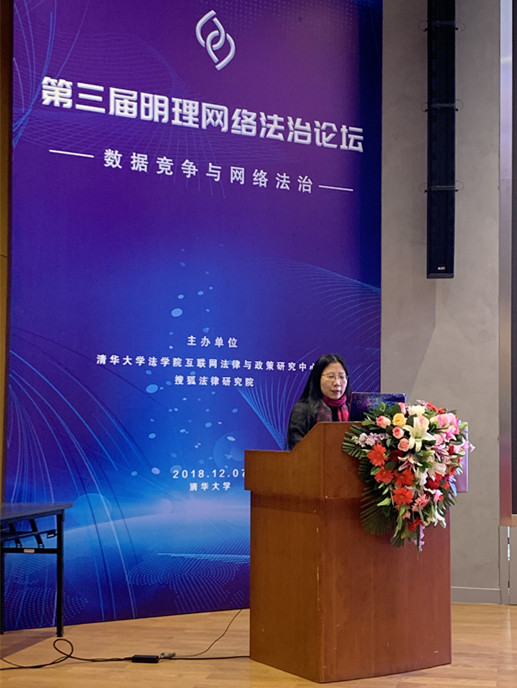 2018年12月7日,应清华大学法学院互联网法律与政策研究中心的邀请,杜颖教授参加“第三届明理网络法治论坛”。本届论坛由清华大学法学院互联网法律与政策研究中心以及搜狐法律研究院共同主办,主题为“数据竞争与网络法治”。除清华大学法学院的师生外,来自国家市场监督管理总局、最高人民法院、海淀区法院、人民大学、北京理工大学、吉林大学、中国科学院大学、北京师范大学、中央财经大学、中国人民公安大学、搜狐、华为、京东等机构的领导、专家、学者、业界人士等参加了此次论坛。