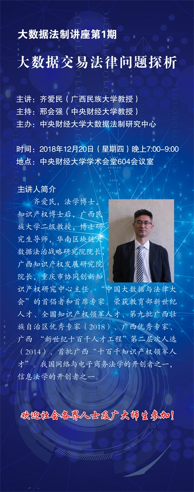 2018年12月20日傍晚,齐爱民教授做客我院,在第1期的大数据法制讲座上发表了题目为“大数据交易法律问题探析”的精彩演讲。齐爱民教授为华南区块链大数据法治战略研究院院长、广西知识产权发展研究院院长、重庆市协同创新知识产权研究中心主任、广西民族大学与重庆大学教授、“中国大数据与法律大会”的倡导者和首席专家。