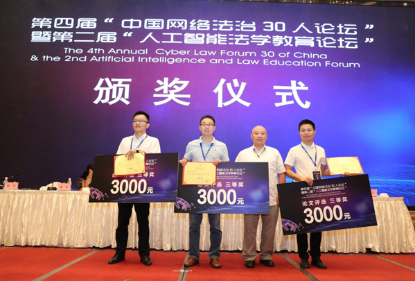 刘权副教授提交的论文《无人驾驶的风险及法律规制:一个框架性分析》,获得三等奖。《东方法学》副主编吴以扬编审、西南政法大学学术期刊评价中心主任林士平编审为获奖论文作者颁奖。据悉,此次论坛提交的论文质量较高,具有学科跨界融合研究的总体特征,论文数量也为历届之最。此次从众多论文中共评出三等奖3名、二等奖2名、一等奖空缺。获奖的论文还有《建设以阿西莫夫机器人学法则为基础的现代人工智能伦理》《人工智能自动化执法:理论冲击及其调适》《个人信息的身份识别标准:源流、实践与反思》《人工智能医疗应用及面临的主要法律问题分析》。